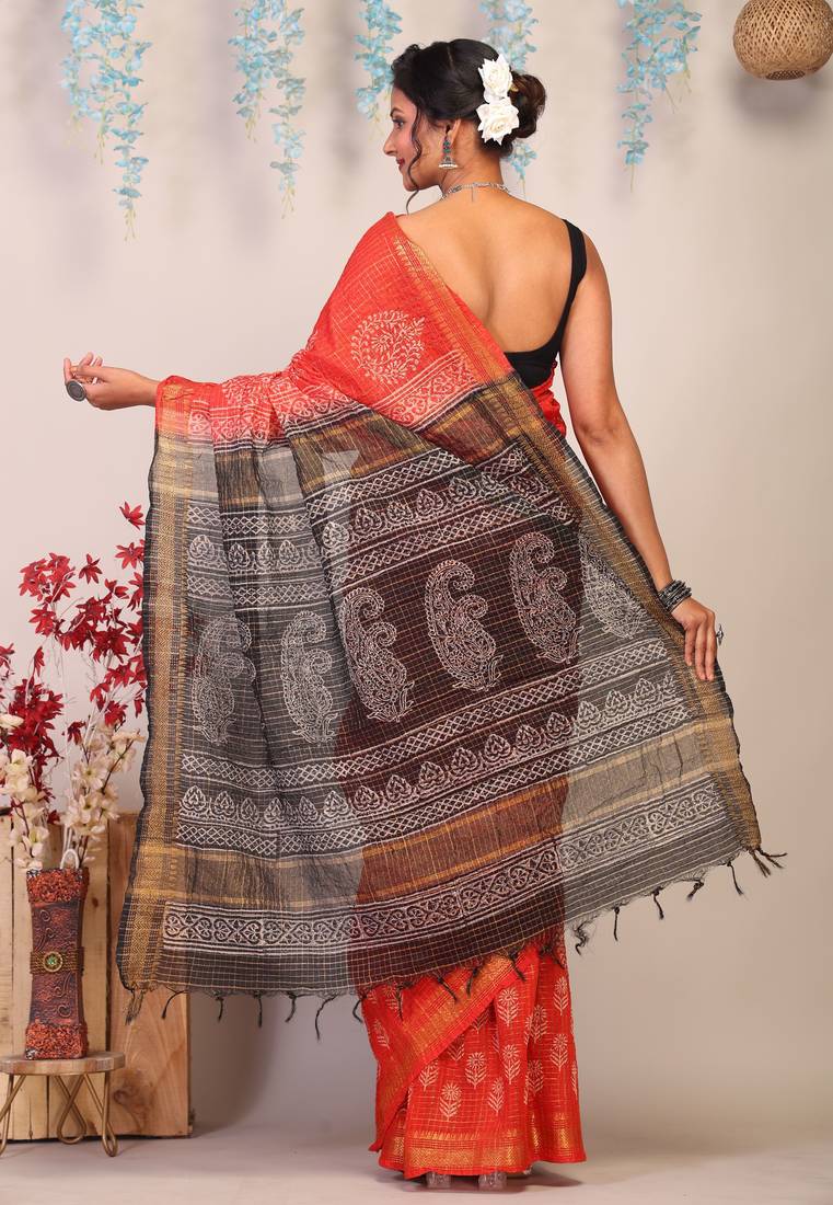 Red & black zari work, dabu embroidery cotton silk blend bhagalpuri ethnic saree with unstitched blouse