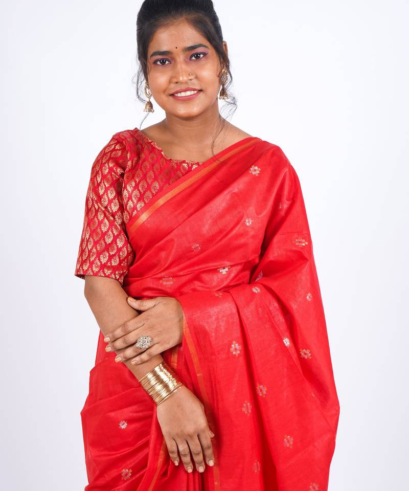 | Product Description | Turn Heads With This Anuttara Women’s Bhagalpuri Cotton Silk Saree In A Vibrant Red Shade. Beautifully Crafted With Zari Buta Motifs, Delicate Sequins, And Elegant Frill Accents, This Saree Perfectly Blends Festive Glamour With Timeless Tradition.Made From Lightweight Bhagalpuri Cotton Silk, It Drapes Effortlessly And Feels Soft Against The Skin. The Thin Golden Zari Border Highlights Its Ethnic Charm, While The Matching Unstitched Blouse Piece Completes The Set. |