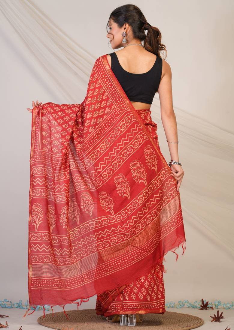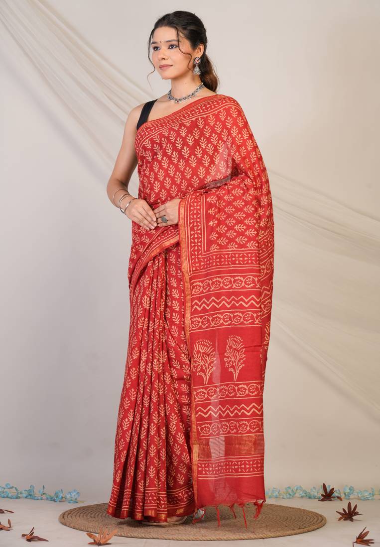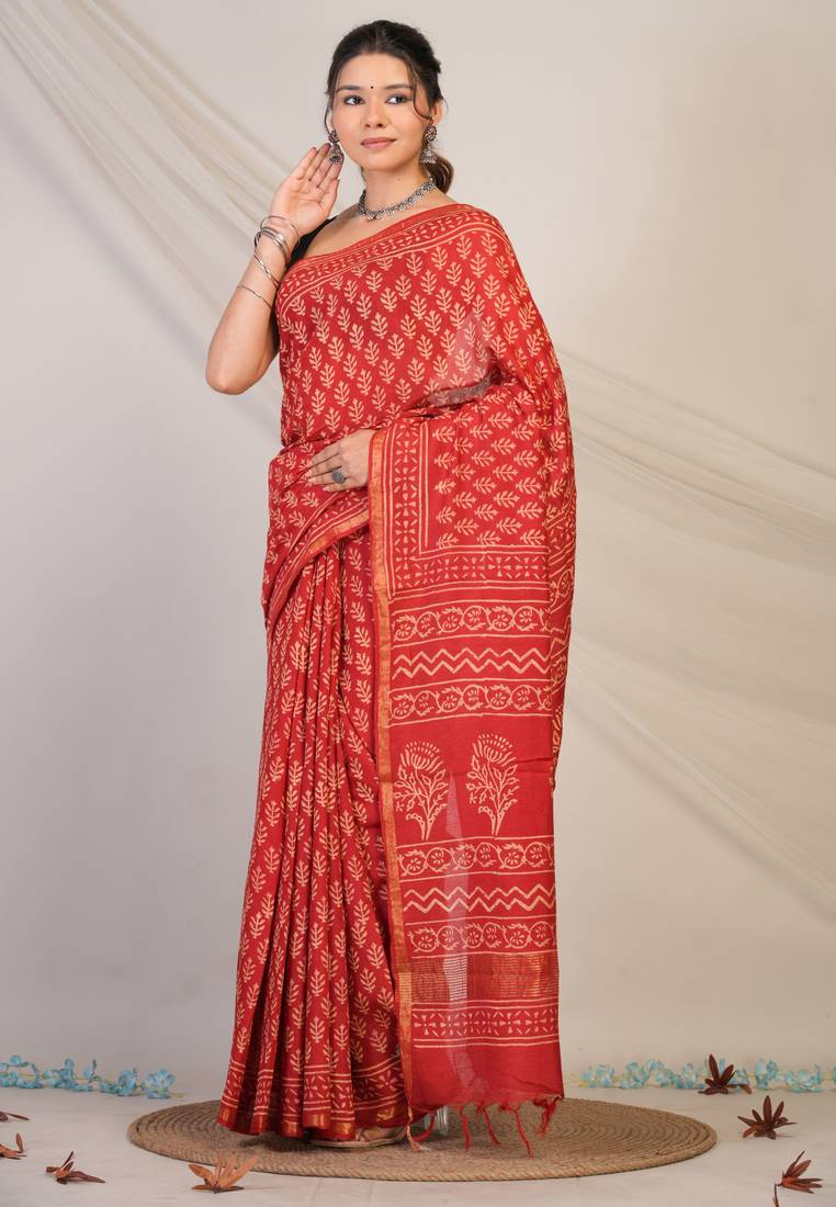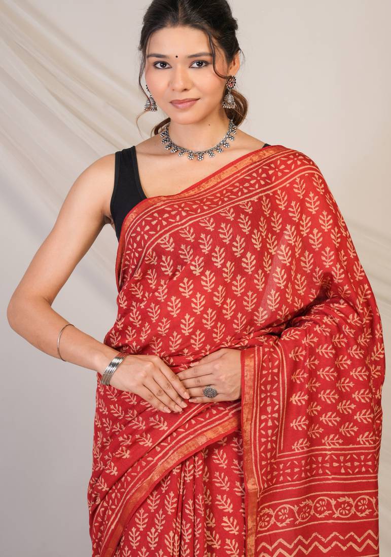 | Product Description | Crafted From Luxurious Cotton Silk (Art Silk), This Saree Flows Effortlessly With A Soft, Breathable Texture That Feels As Graceful As It Looks.The Bold Red Shade Exudes Royal Charm And Sophistication, Perfectly Complemented By Intricate Floral Hand Block Prints That Showcase Masterful Artistry. A Delicate Golden Zari Border Adds A Subtle Sparkle, While Refined Zari Embellishments And Playful Tassels Complete The Festive Look With Finesse. |