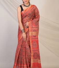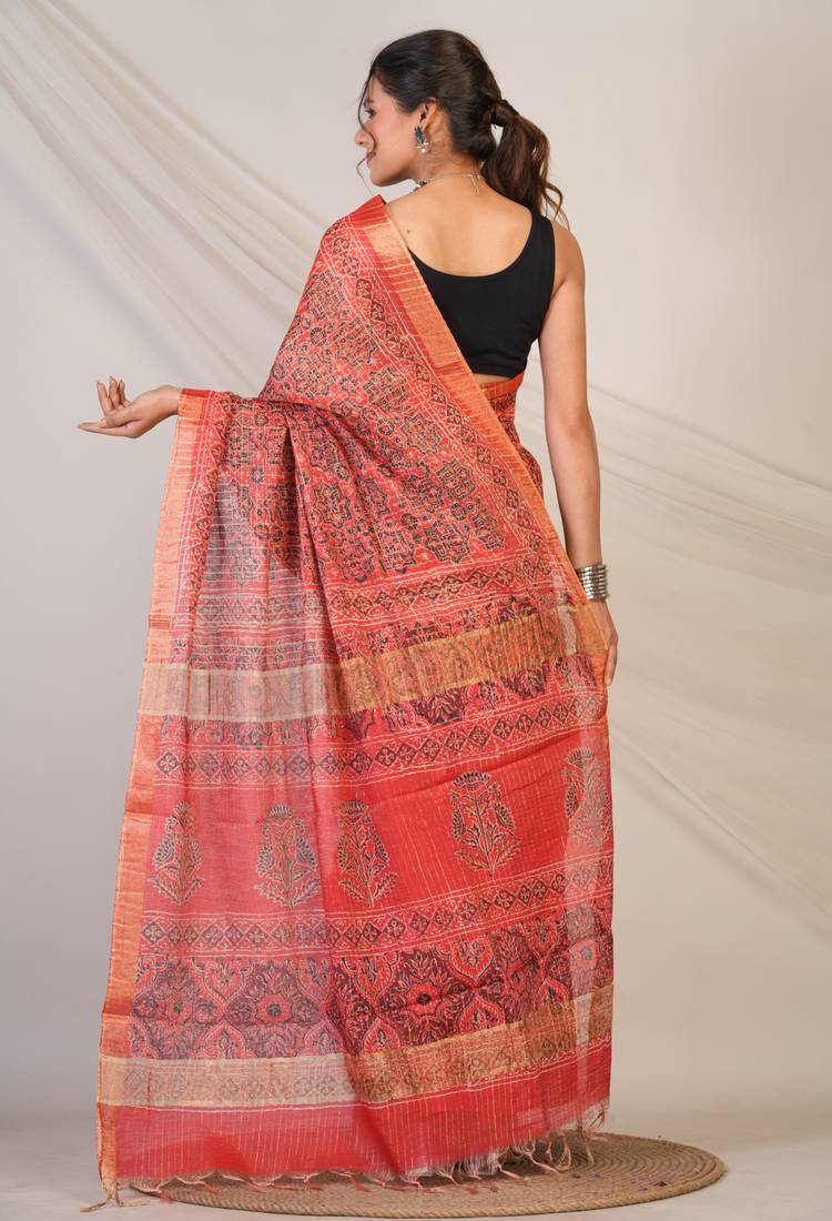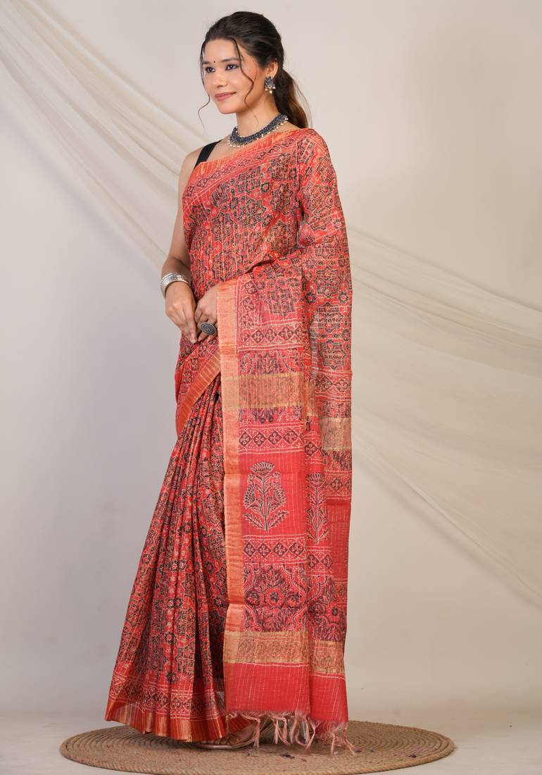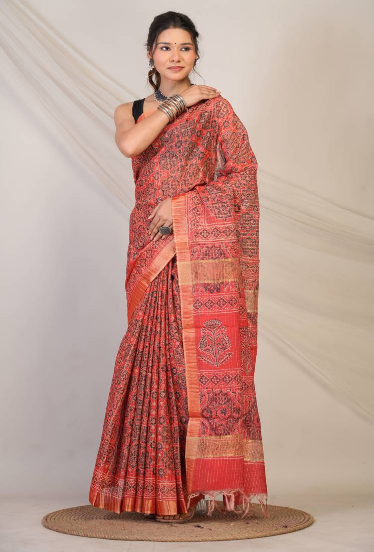 | Product Description | Crafted From Premium Cotton Silk (Art Silk), This Saree Features Hand Block Ajrakh Prints That Add A Touch Of Rustic Charm And Artisanal Finesse. The Deep Red Base Is Elevated With A Grand Golden Zari Border, Making It The Perfect Choice For Wedding Functions, Festive Occasions, Or Cultural Celebrations.Finished With Elegant Tassels And Intricate Zari Detailing, This Saree Is More Than Just An Outfit—It’s A Statement Of Style And Heritage. |