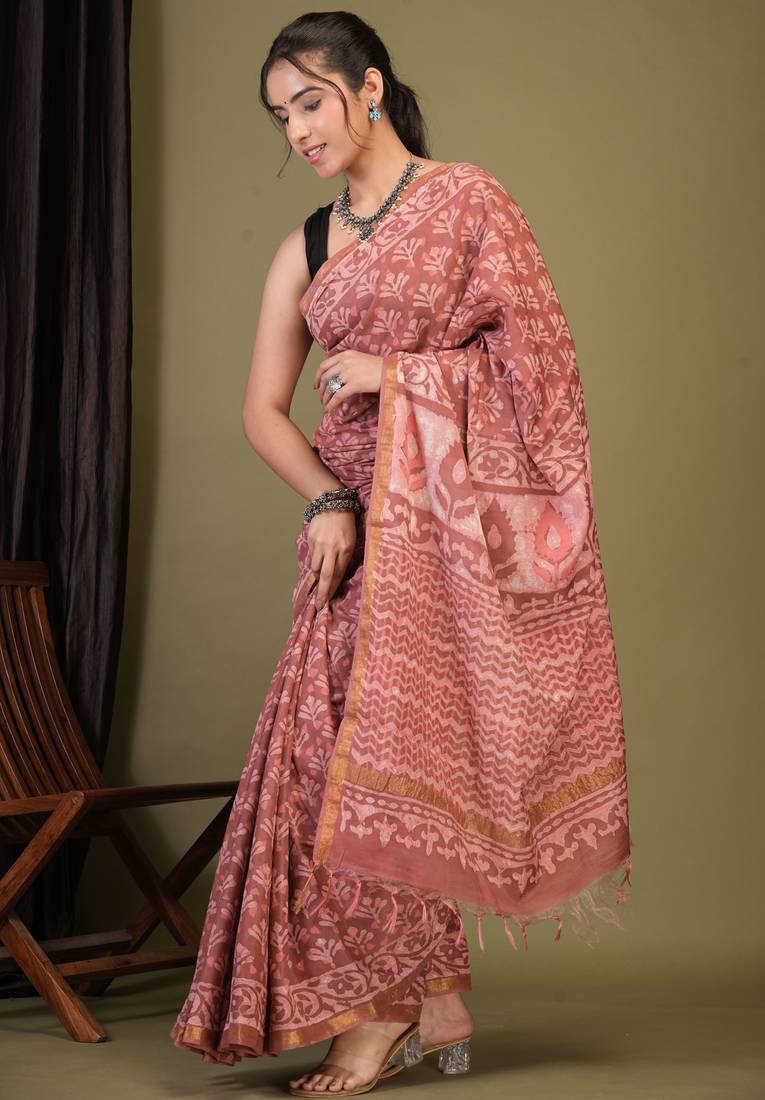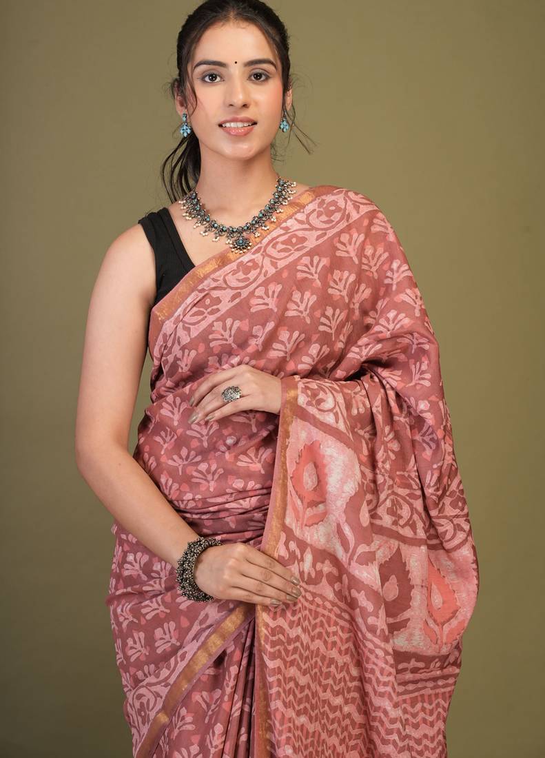 Rouge pink zari work cotton silk blend bhagalpuri ethnic saree with unstitched blouse