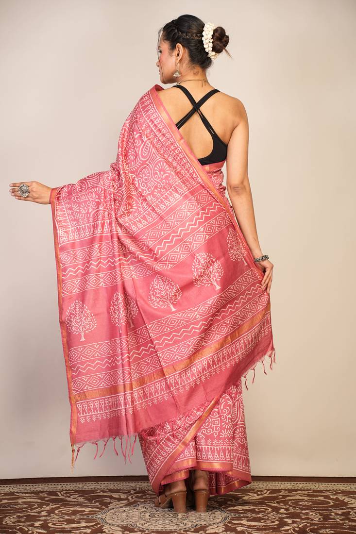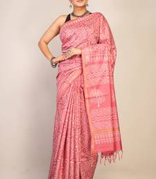 Salmon pink zari work cotton silk blend bhagalpuri ethnic saree with unstitched blouse
