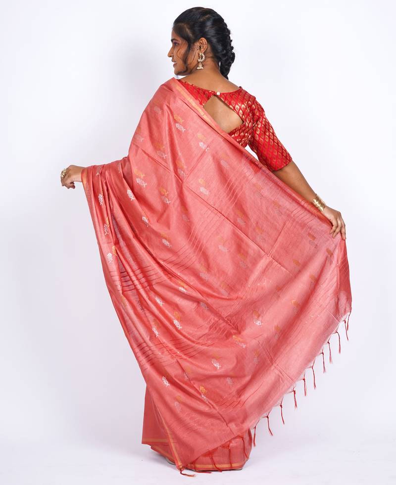 Salmon pink zari work, sequence cotton silk blend bhagalpuri ethnic saree with unstitched blouse