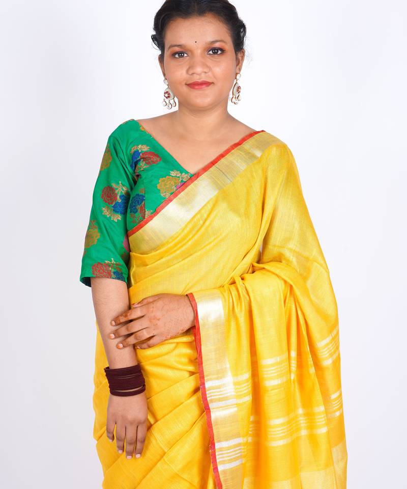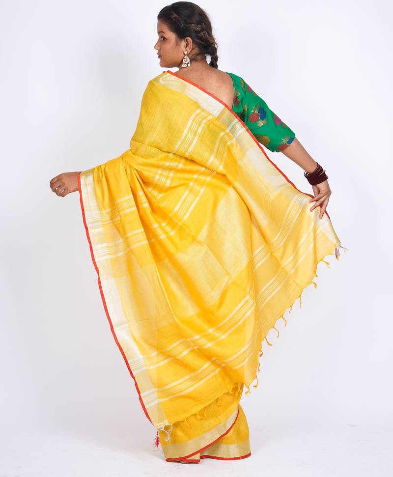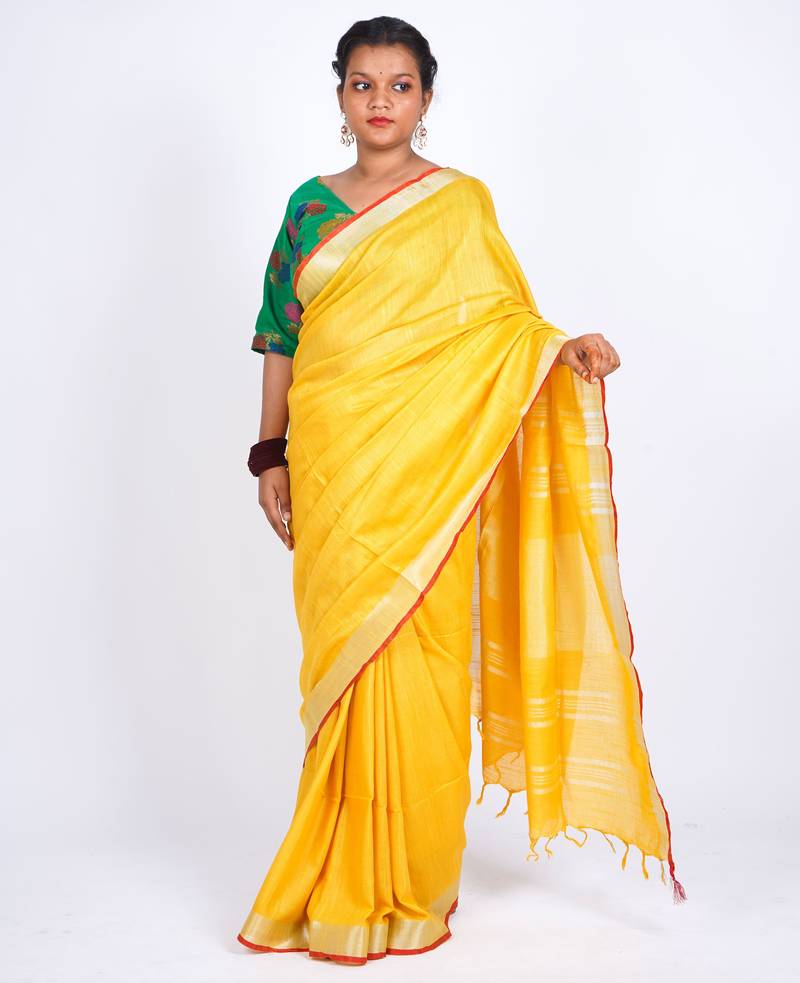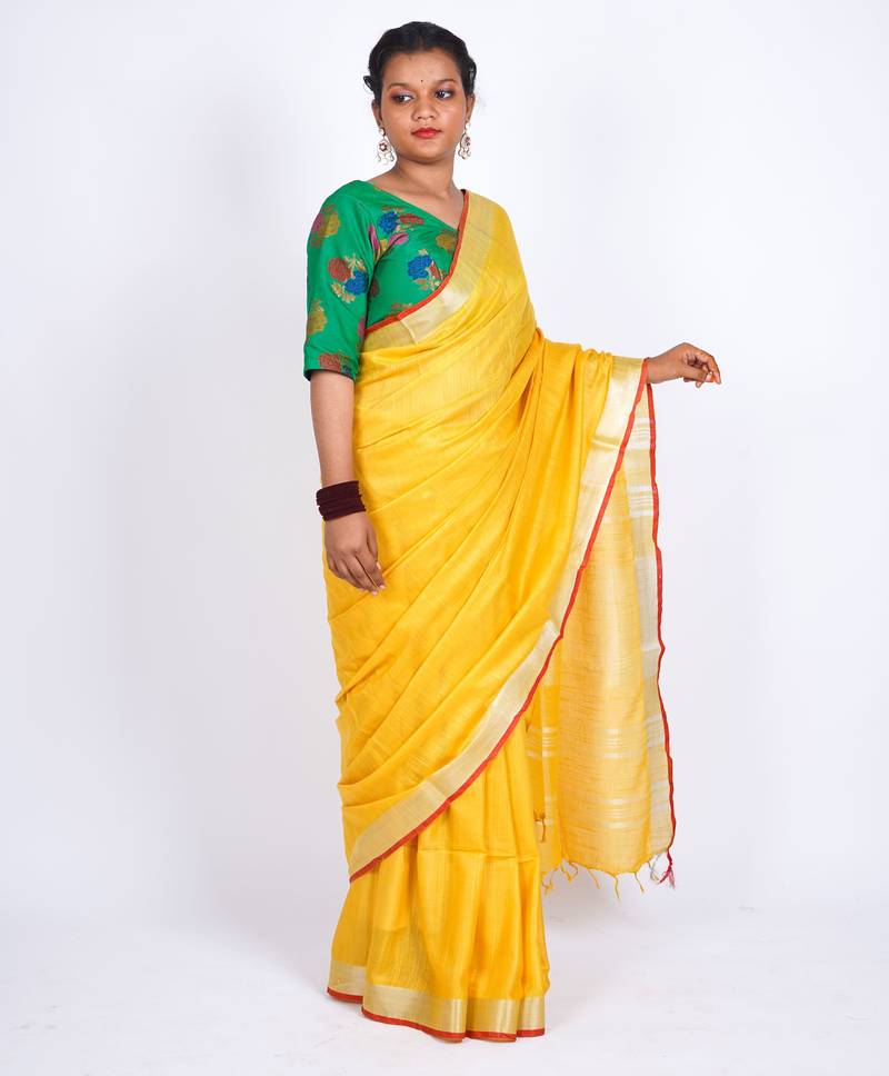 Brighten Your Ethnic Collection With This Anuttara Women’s Bhagalpuri Cotton Linen Saree In A Radiant Yellow Shade. Featuring A Solid Pattern Enhanced With Silver Zari Embellishments And Elegant Frill Detailing, This Saree Offers A Perfect Mix Of Festive Charm And Modern Style.