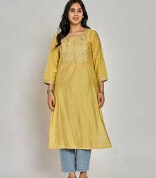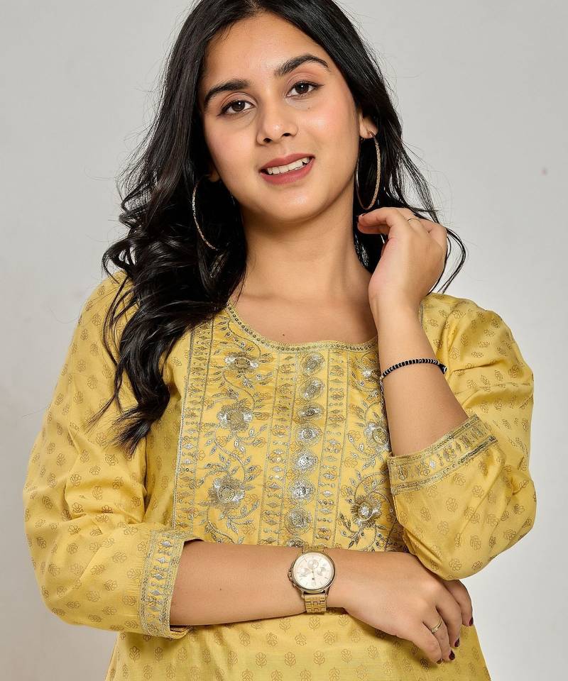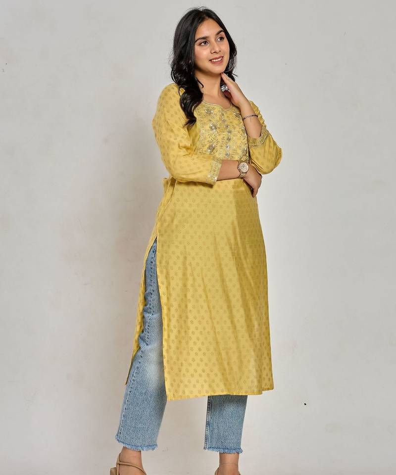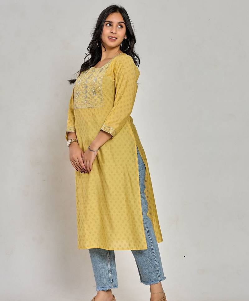 | Product Name | Mustard Yellow Color Gold Print / Zari Embroidery Kurti | |