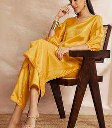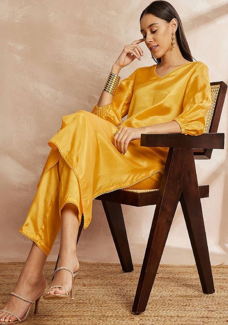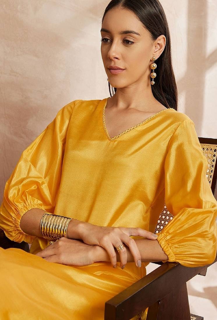 | Product Name | Yellow Color V Neck Three Quarter Sleeves Puffed Sleeves A Line Kurta With Trousers | |