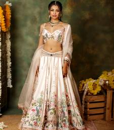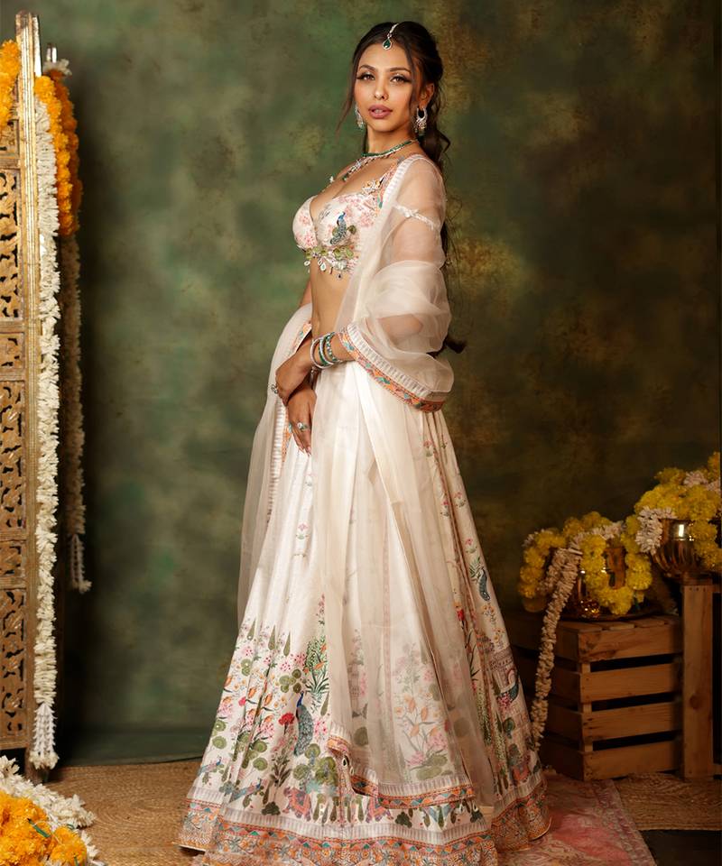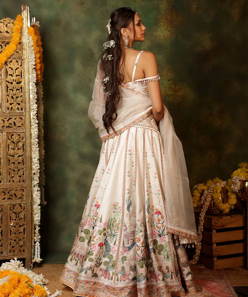 Ivory printed raw silk lehenga set