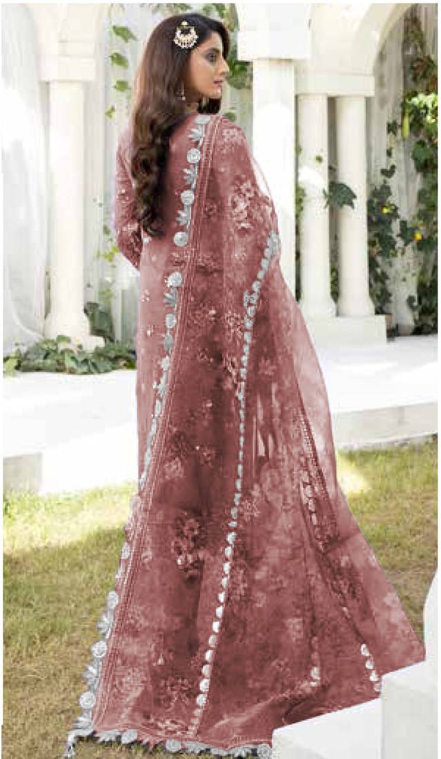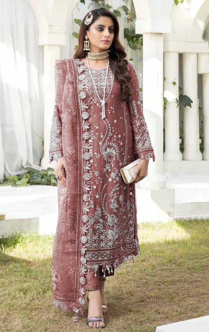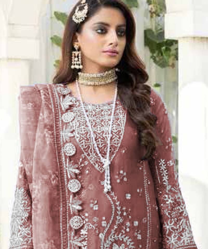 Dark-coral color embroideried faux georgette semi stitched salwar suit