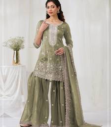 Product Name | Mehendi Color Embroideried Faux Glass Tissue Salwar Suit | |
