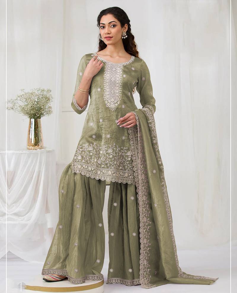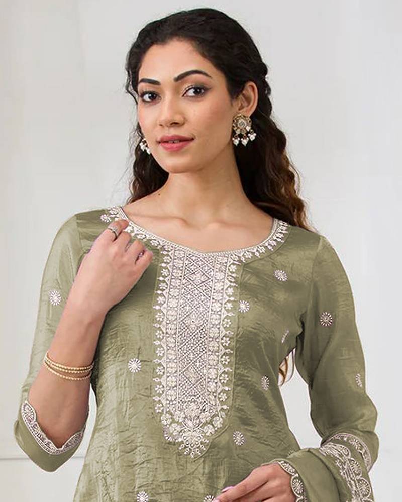 Mehendi color embroideried faux glass tissue salwar suit semi stitched