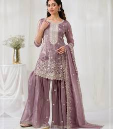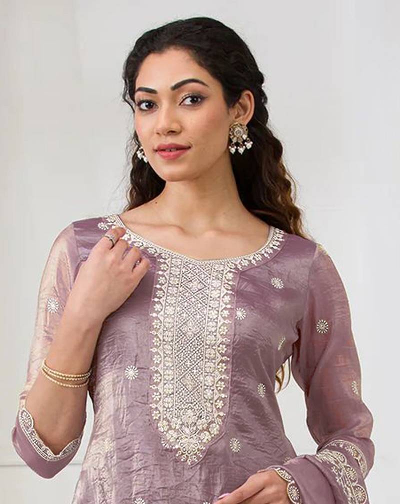 Onion pink color embroideried faux glass tissue salwar suit semi stitched