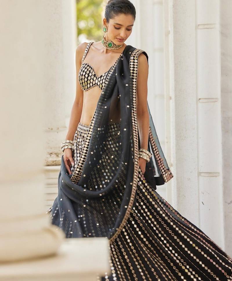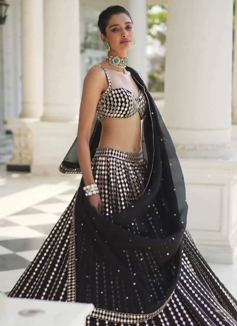 Black mirror embroidery organza silk lehenga choli with dupatta