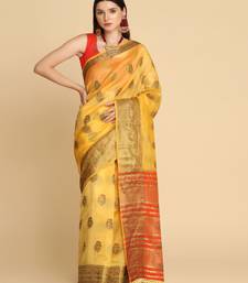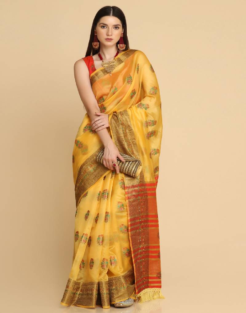 | Product Description | Yellow Organza Silk With Stone Work Designer Party Wear Woven Saree With Come Red Art Silk Designer Woven Blouse. |