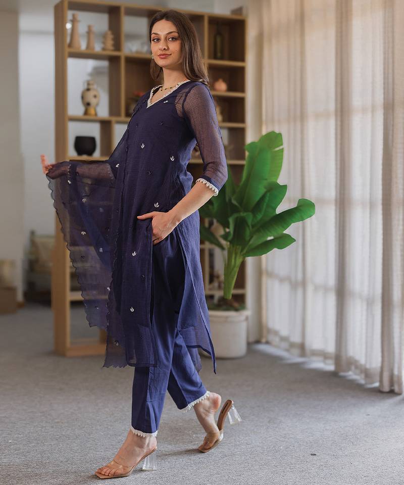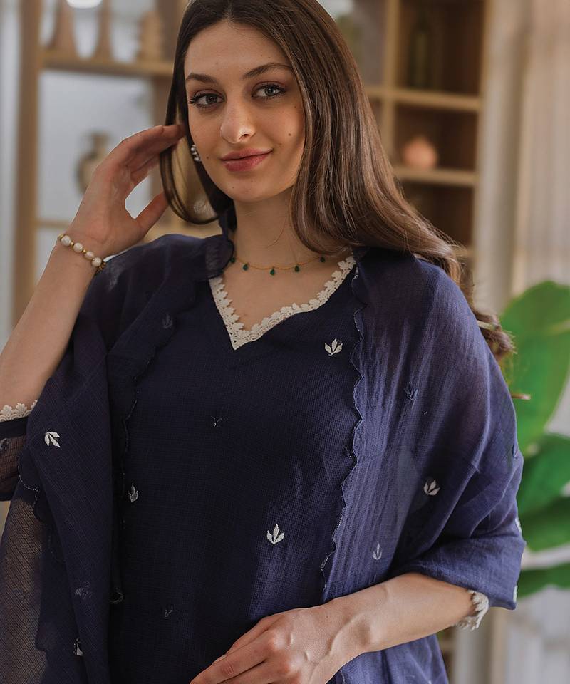 | Product Name | Navy Blue Embroidered Cotton Straight Suit Set | |