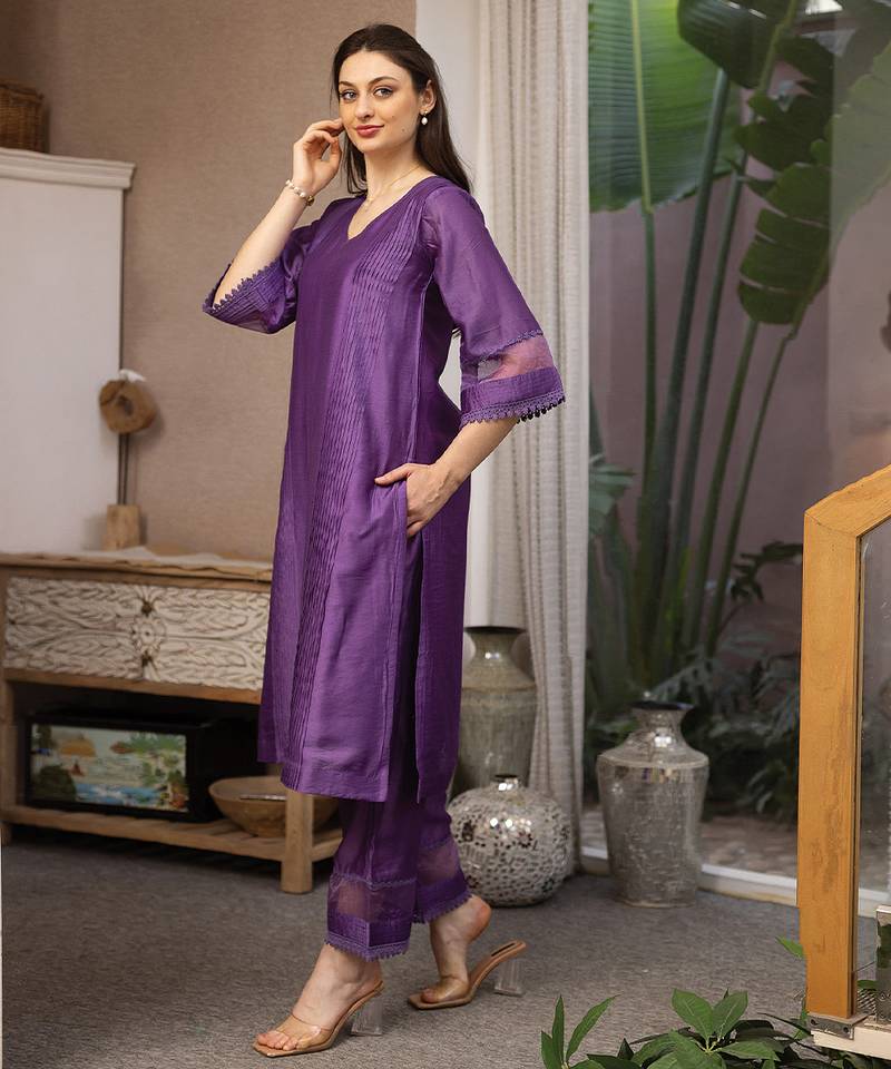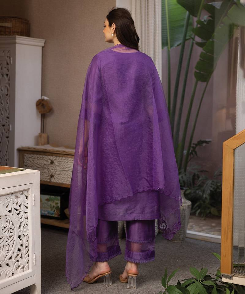 | Product Description | This Purple Embroidered Chanderi Straight Suit Set Exudes Richness And Elegance. The Subtle Sheen Of Chanderi Fabric Combined With Intricate Embroidery Creates A Luxurious Appeal. Ideal For Festive And Special Occasions, It Adds A Regal And Sophisticated Touch To Your Ethnic Wardrobe.