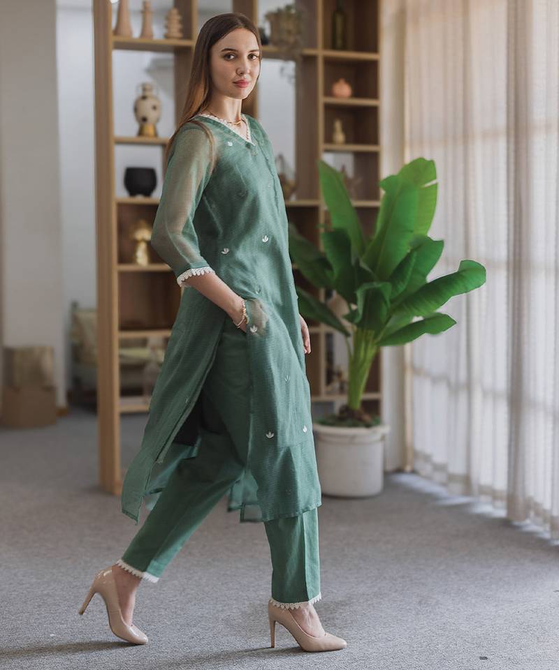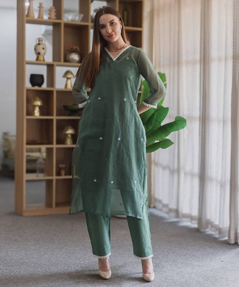 Green embroidered cotton straight suit set