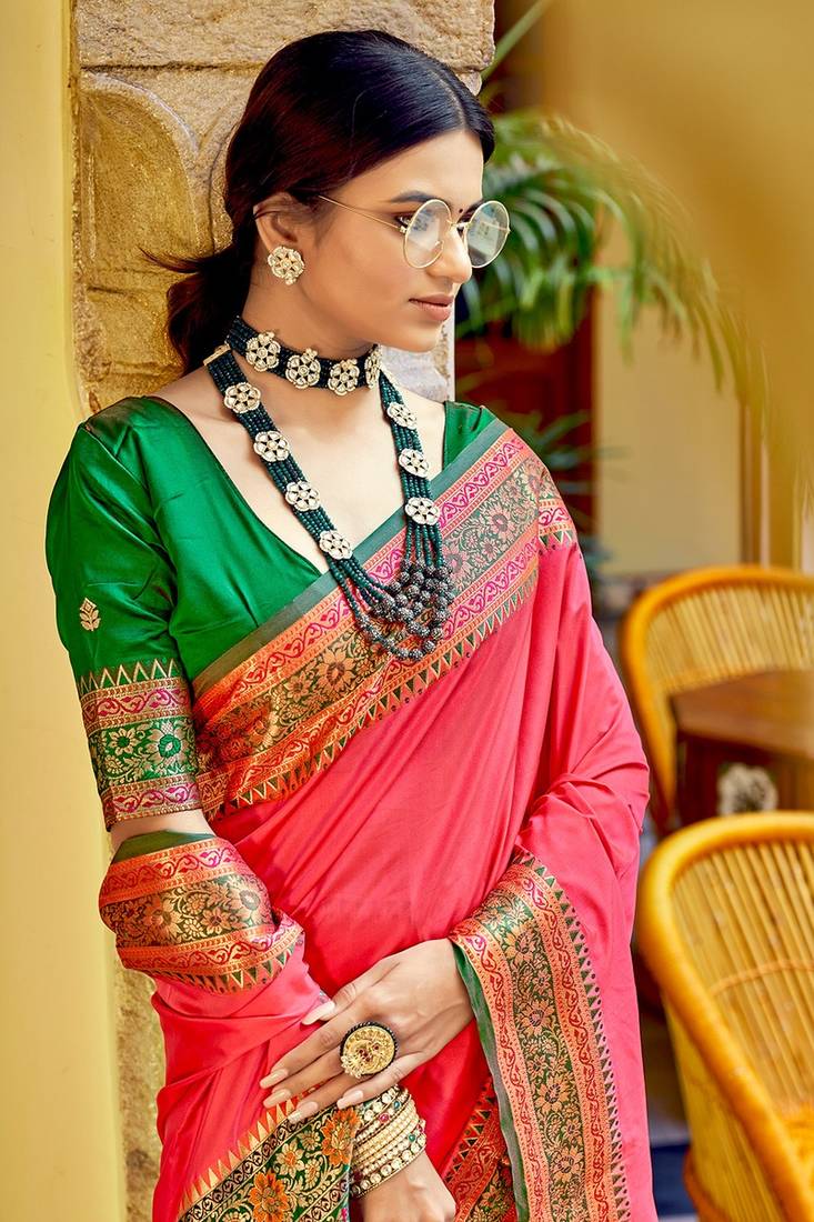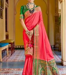 Pink soft banarasi plain silk saree with weaving work