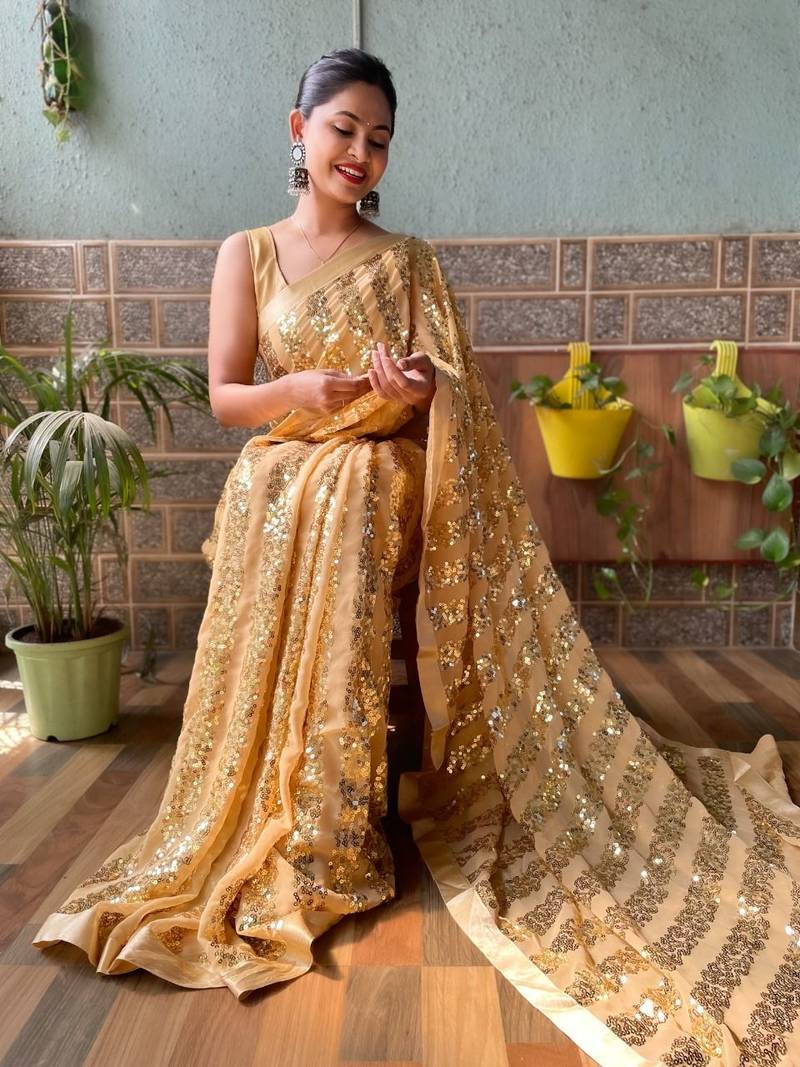 | • | Saree | : | Color- Light Orange / Fabric- Faux Georgette |