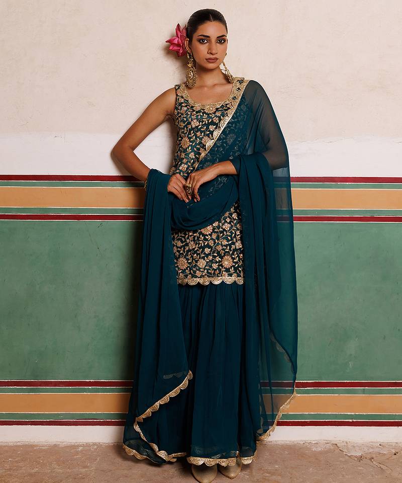 | Product Description | This Green Embroidered Crepe Sharara Set Exudes Festive Elegance With Its Vibrant Hue And Intricate Embroidery. Crafted From Smooth, Flowy Crepe Fabric, It Ensures Comfort And A Flattering Silhouette. Perfect For Weddings, Celebrations, Or Festive Gatherings, This Set Beautifully Combines Traditional Artistry With Contemporary Style.