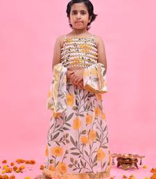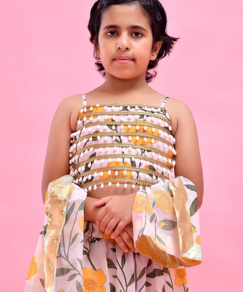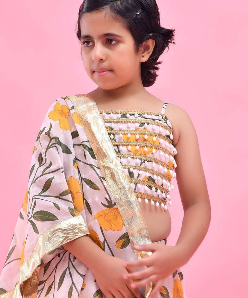 Product Description | Featuring An Off White, Floral Printed Lehenga Set In Chanderi Fabric. It's Paired With A Pearl Lace Embellished Blouse And Chanderi Dupatta.