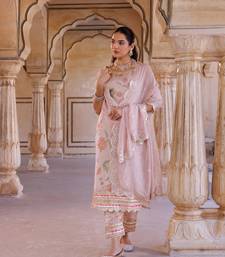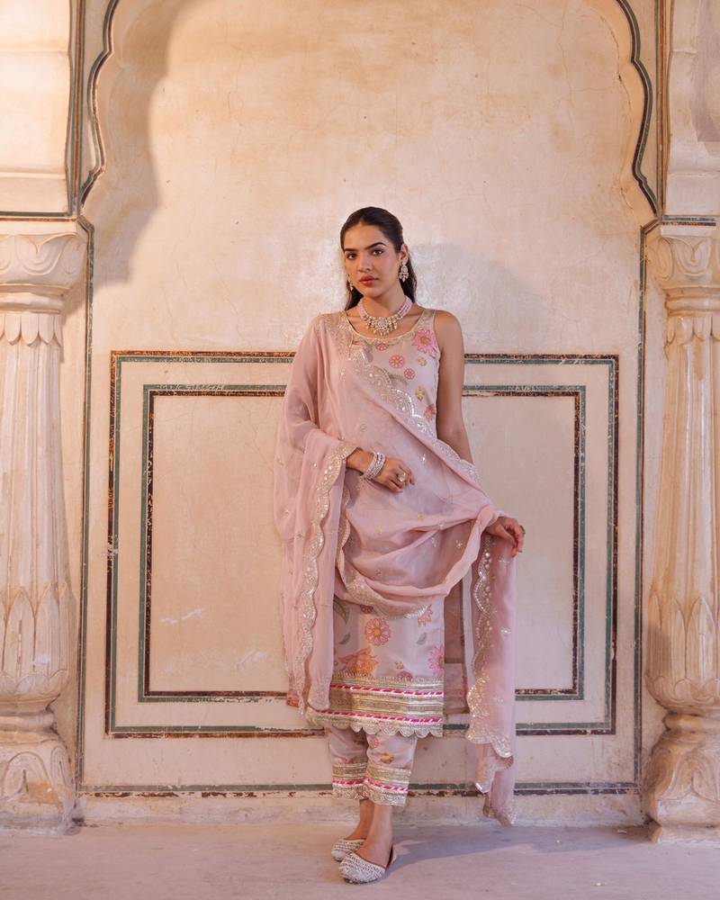 Product Description | Pastel Pink Tissue, Floral Printed Kurta Set With Lace Embellished Details On Kurta & Pant. Paired With An Embroidered Georgette Dupatta.