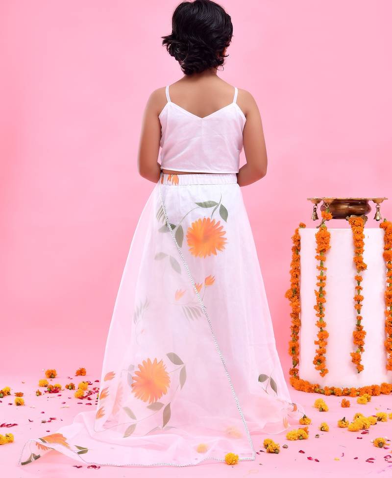 Product Description | Featuring A White Organza, Hand Painted Sunflowers, Lehenga Set . It's Paired With A Plain Organza Blouse And Gota Embellished Hand Painted Dupatta.