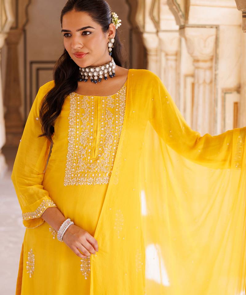 | Product Description | This Yellow Embroidered Silk Sharara Set Radiates Festive Elegance With Its Vibrant Hue And Intricate Embroidery. Crafted From Luxurious Silk Fabric, It Offers A Rich Texture And Graceful Silhouette. Perfect For Weddings, Celebrations, Or Festive Gatherings, This Set Adds A Bright, Traditional Charm To Your Ethnic Wardrobe.