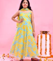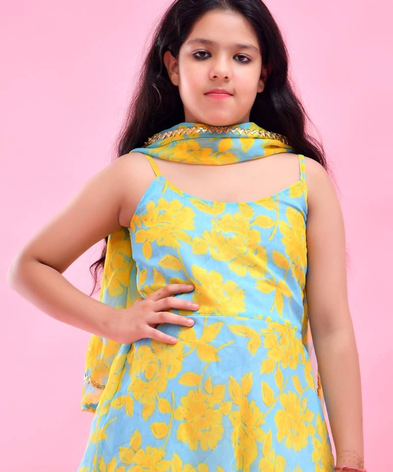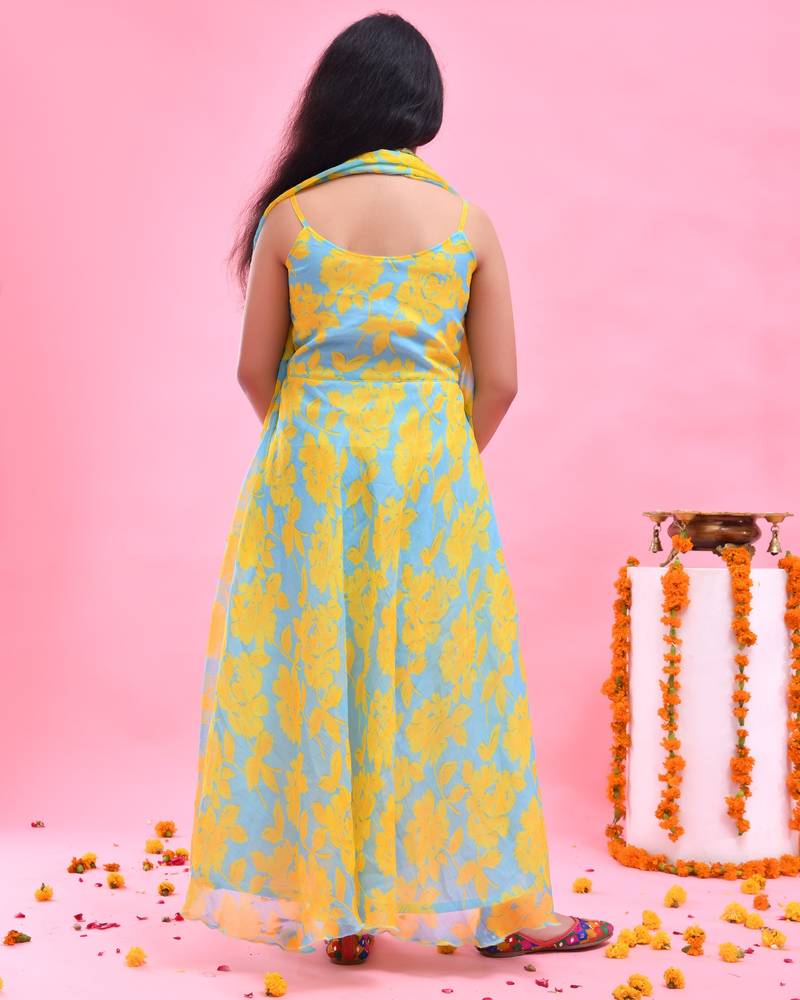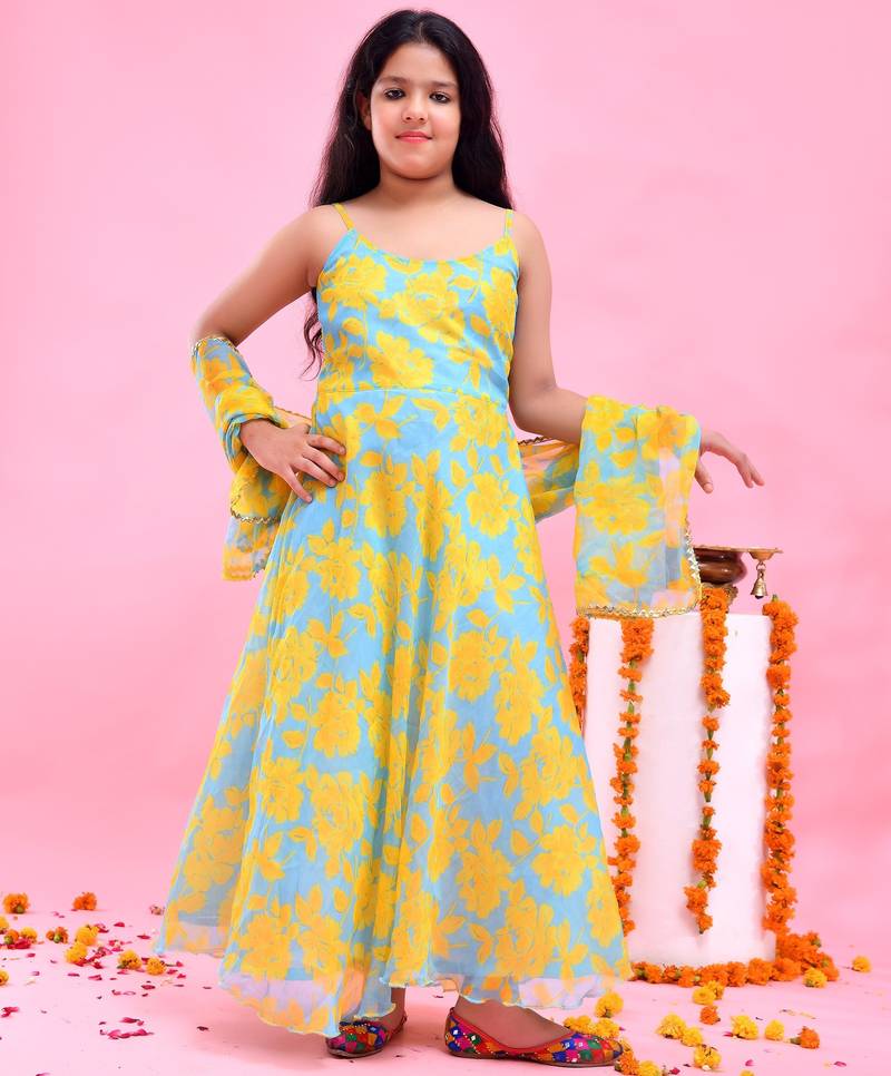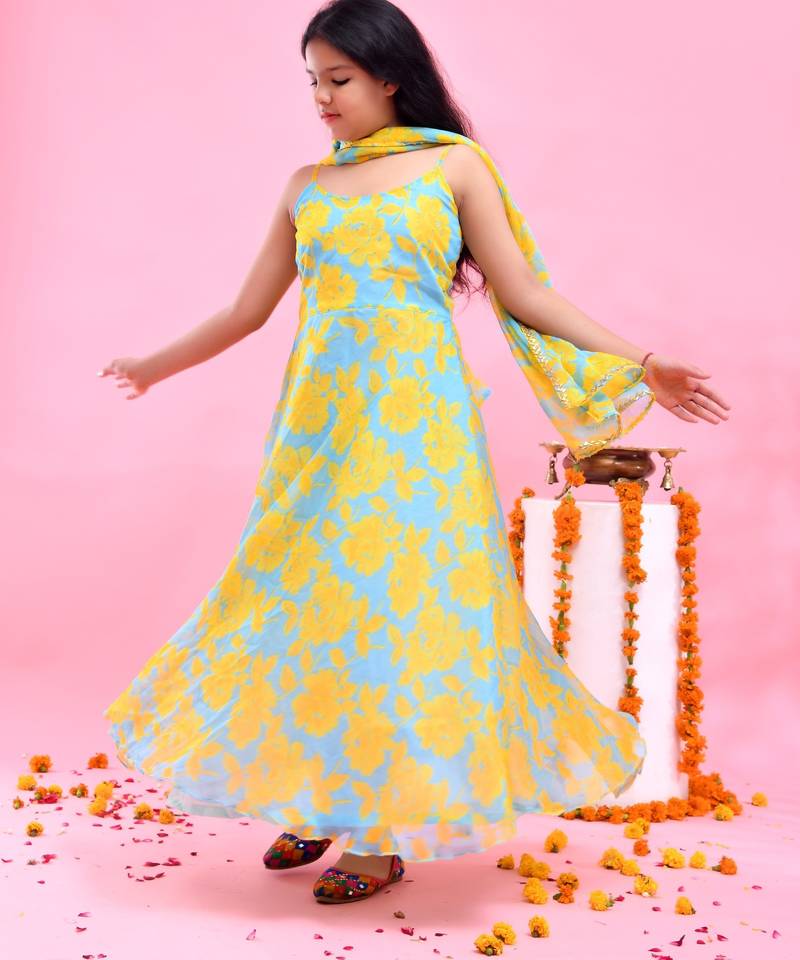 Product Description | Featuring Blue& Yellow, Gota Lace Embellished, Floorlength Anarkali In Chiffon Fabric. It's Paired With A Gota Embellished Chiffon Dupatta.