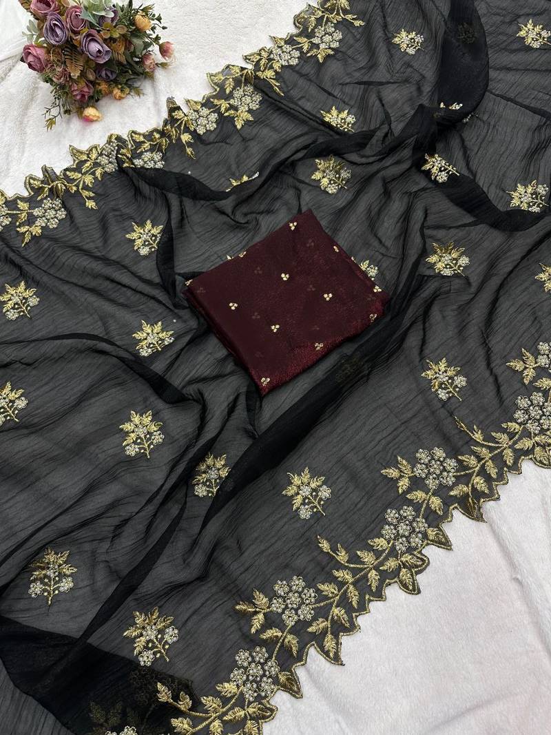 | Product Name | Black Color Embroidery& Moti Work Scalloped Cut Work Border Silk Saree | |