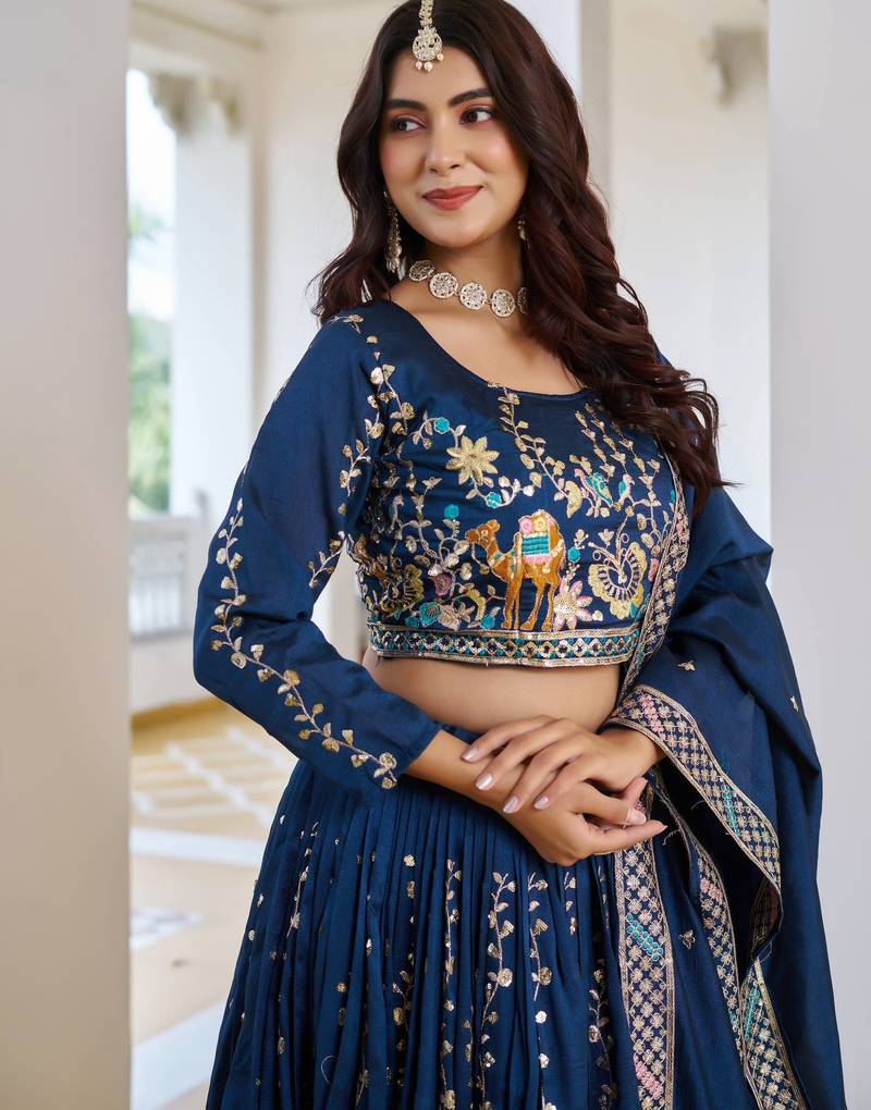 Blue color embroidery sequence with thared work silk lahenga choli set