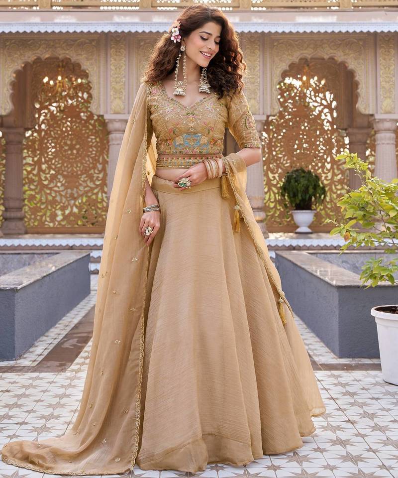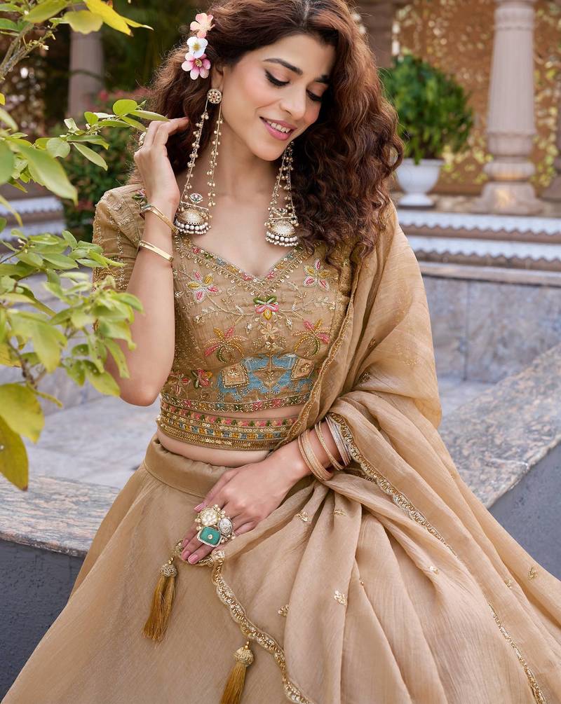 Chikoo color embroidery moti with sequence & thred work silk lahenga choli set