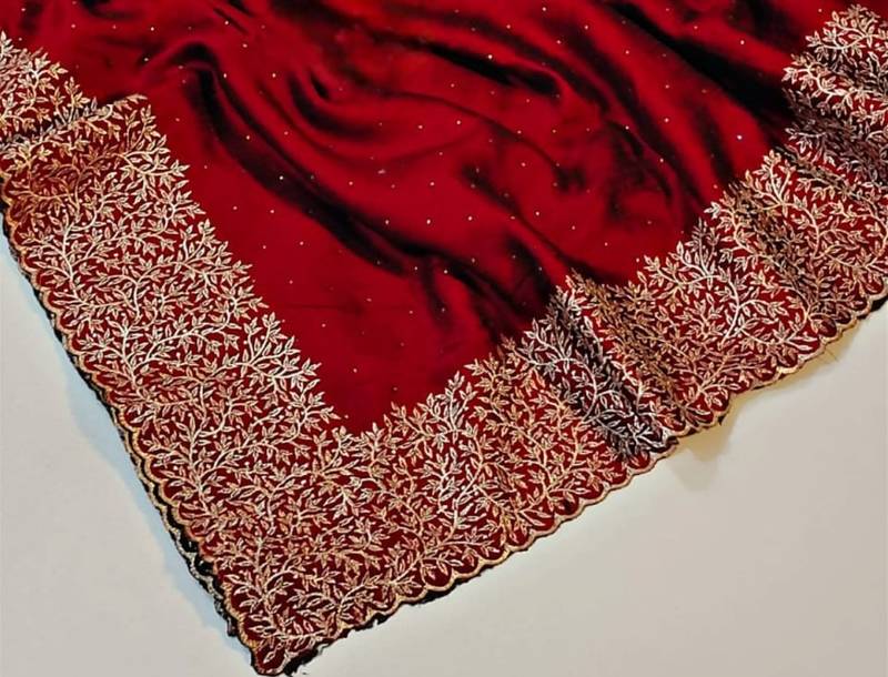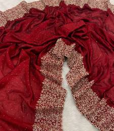 Maroon color silk fabric zari work and stone work saree