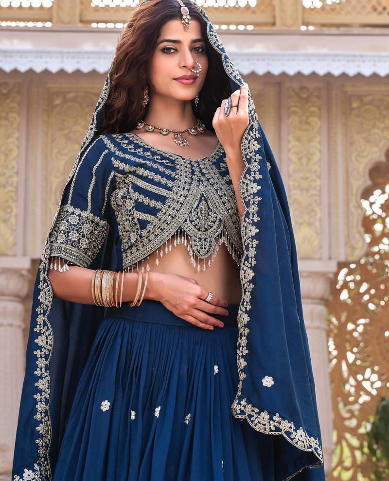 Neavy blue color embroidery sequence with thared work silk lahenga choli set