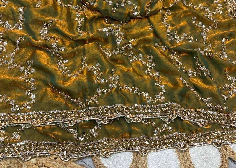 | Product Name | Olive Color Gold Beeds Work With Cut Work Border Silk Saree | |