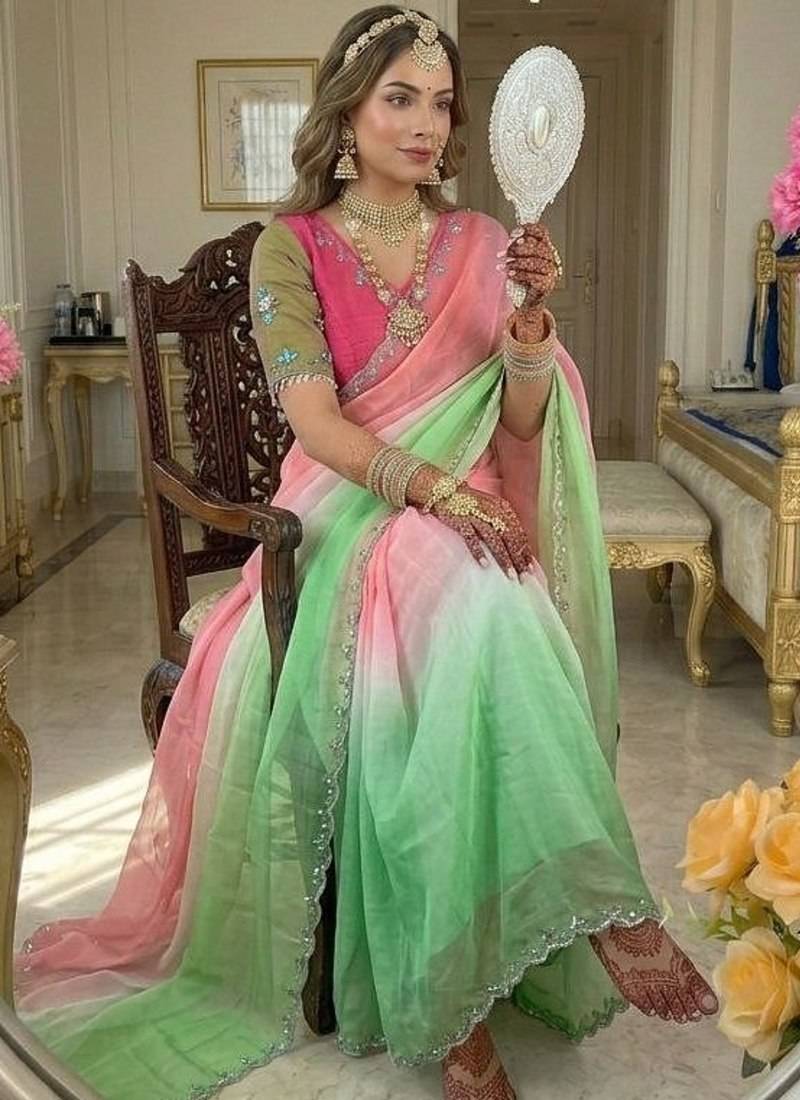 | Product Name | Parrot Green Color Hand Work Khatli Cutdana Moti Work Silk Saree | |