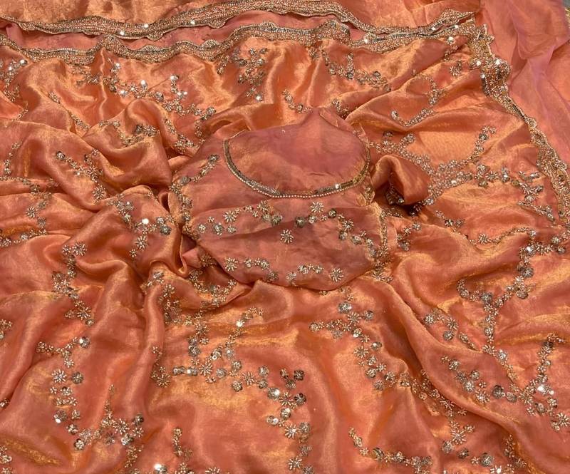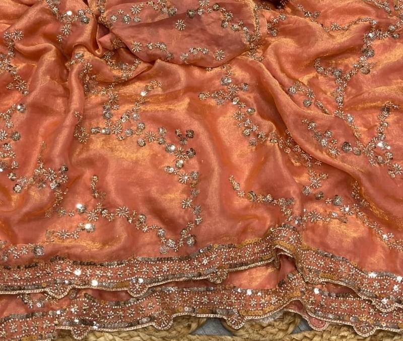 | Product Name | Peach Color Gold Beeds Work With Cut Work Border Silk Saree | |