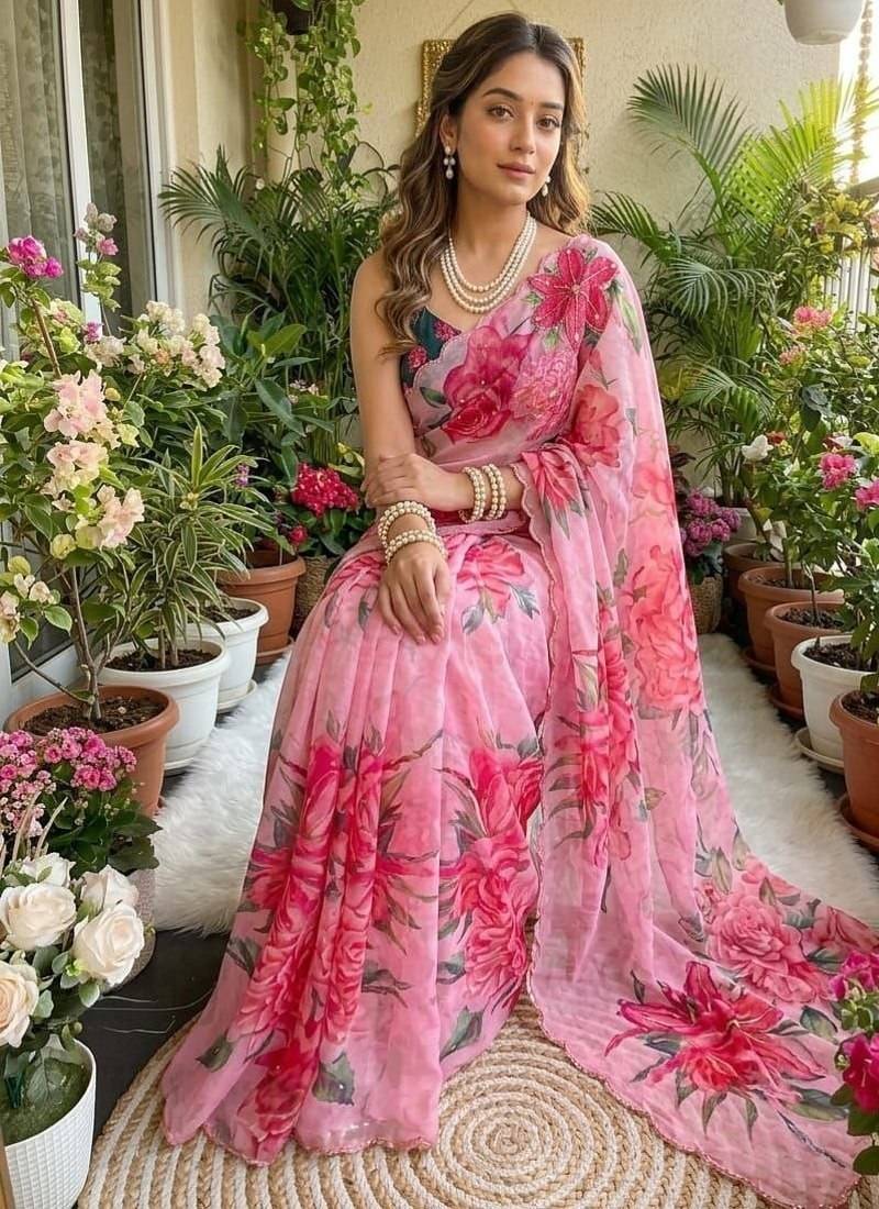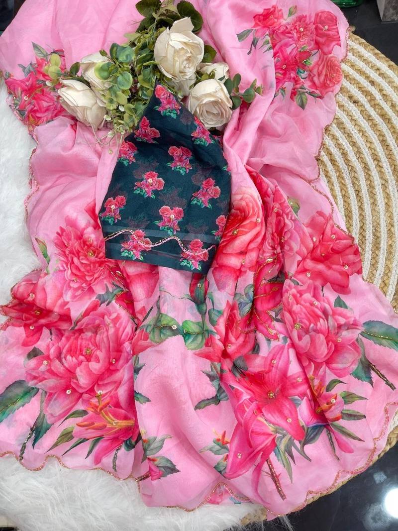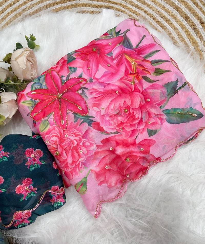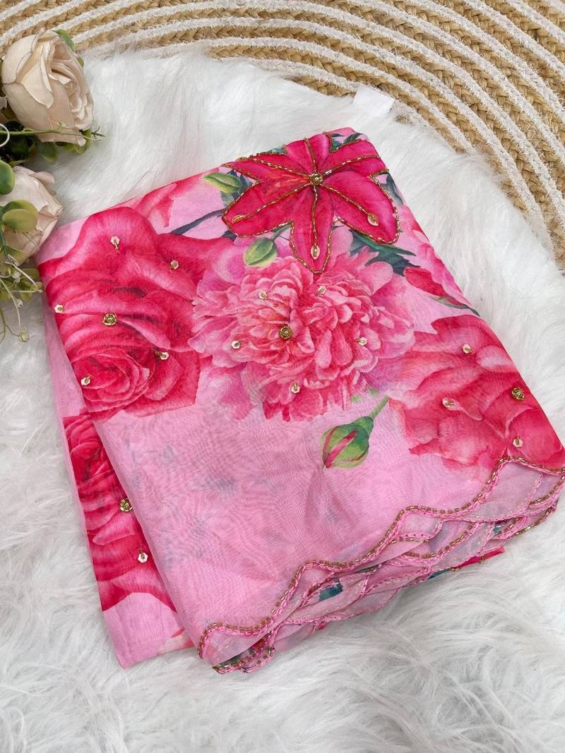 | Product Name | Pink Color Digital Prints Flower And Hand Moti Work Silk Saree | |