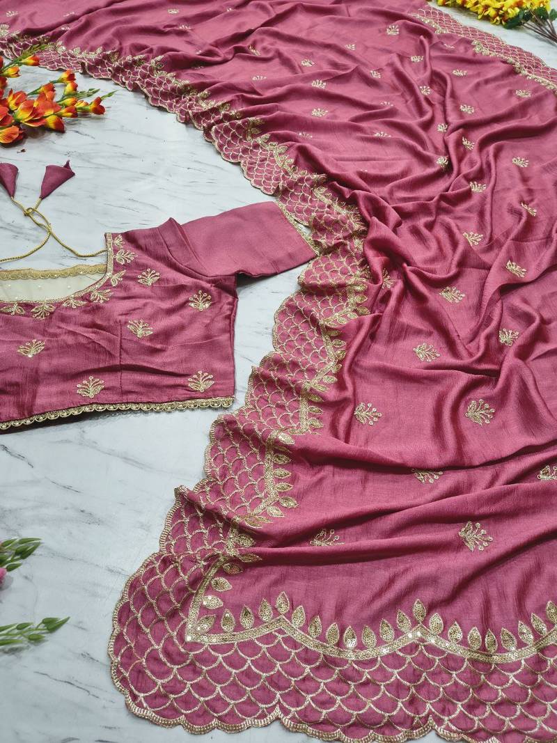 Pink color thread embroidery and sequins work vichitra silk saree