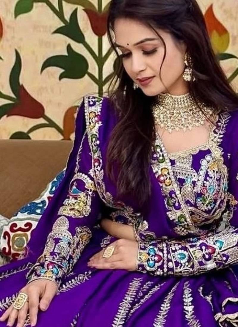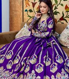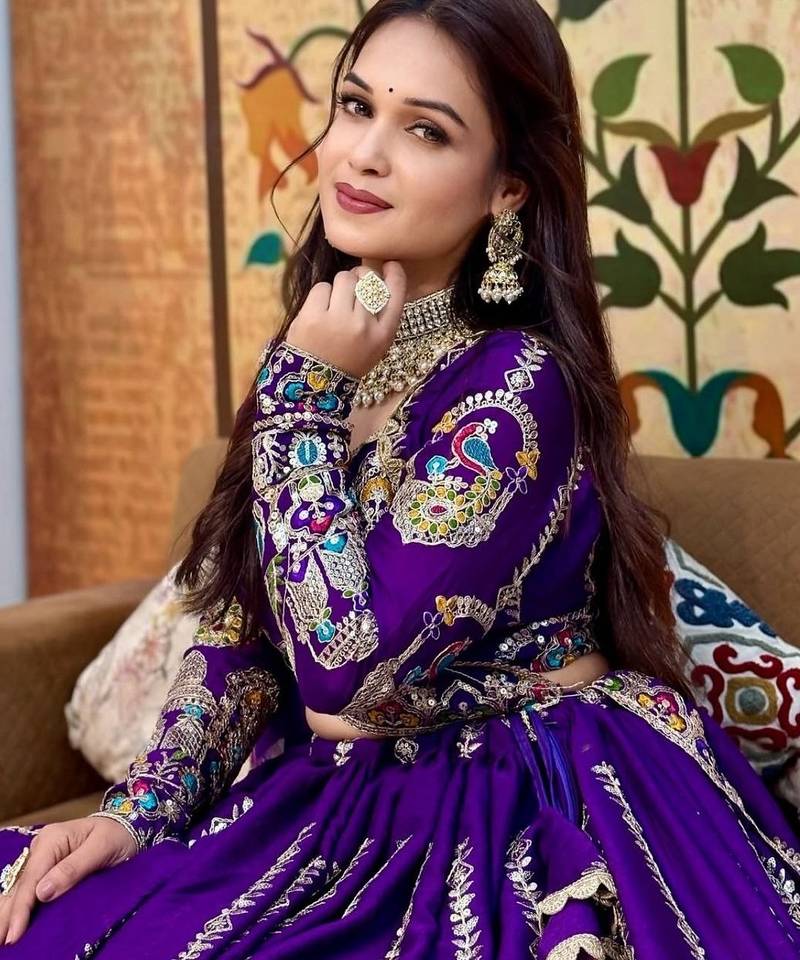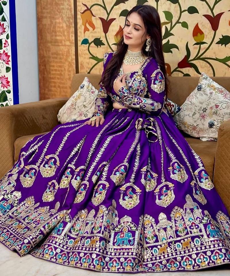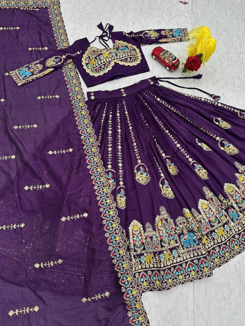 Purple color embroidery coading sequence and thread work vichitra lahenga choli set