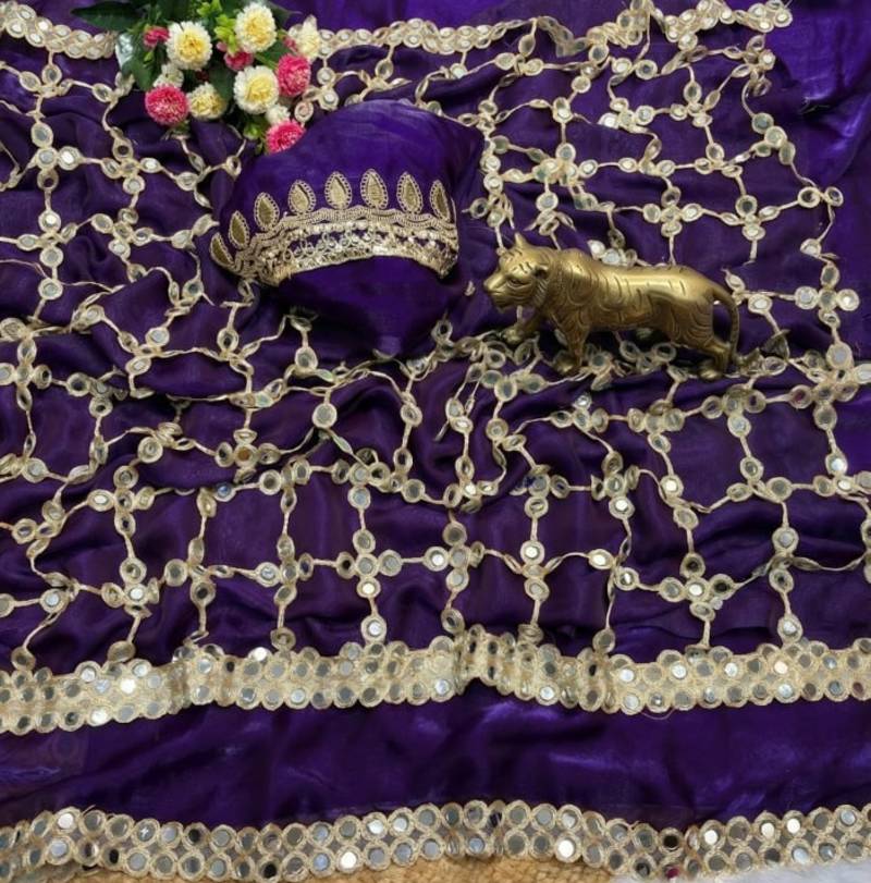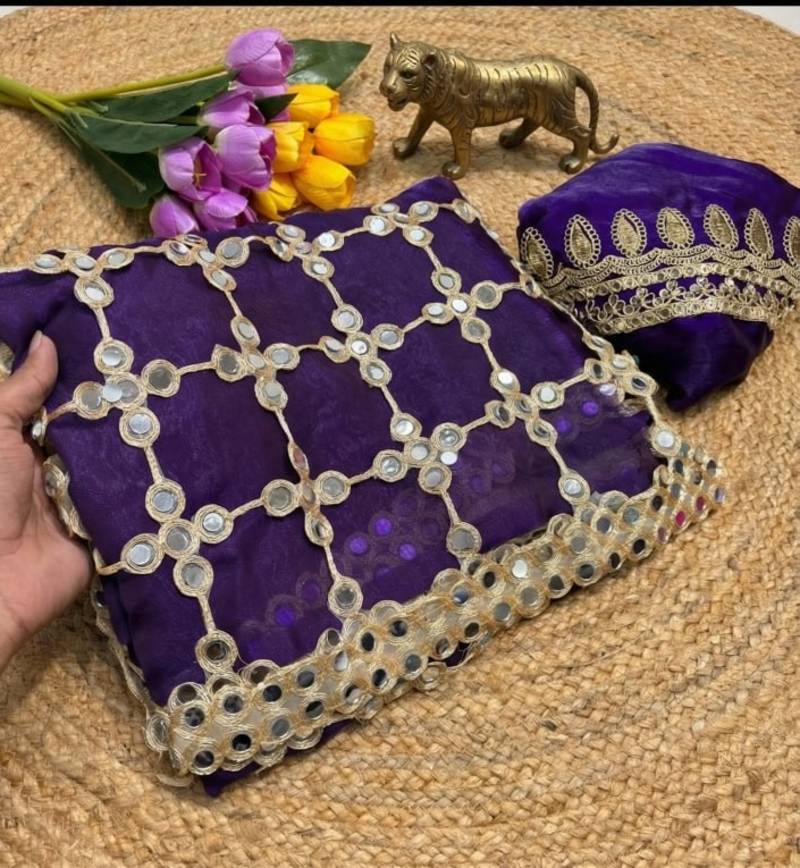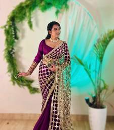 Purple color real mirror work lace satin silk saree