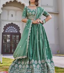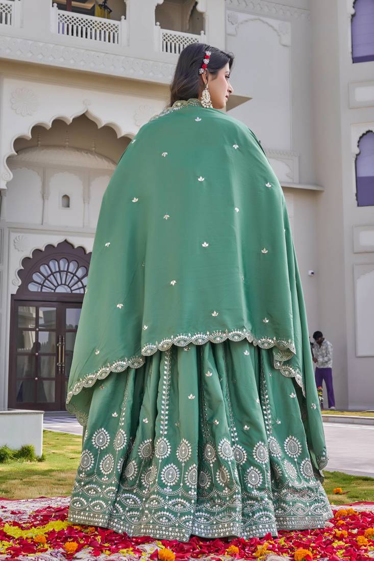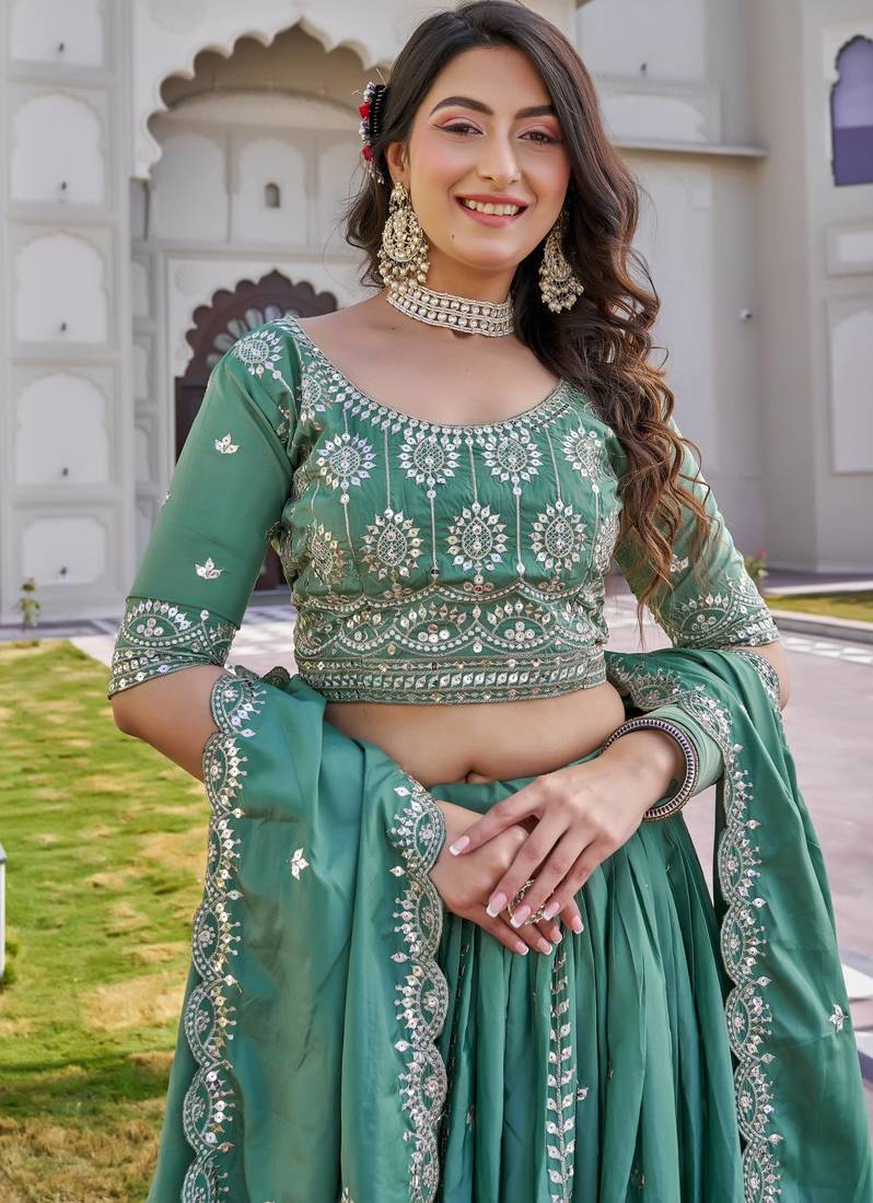 Teal color embroidery sequence work silk lahenga choli set