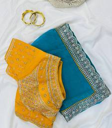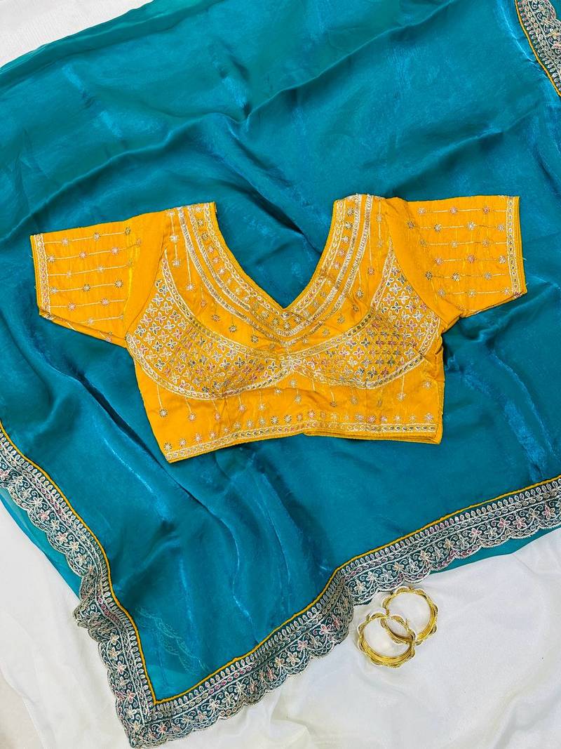 Turuqoise color embroidery fancy lace border satin saree