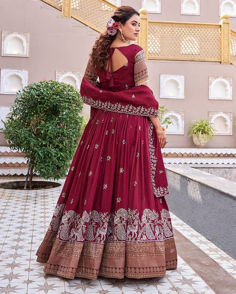 Product Name Wine Color Embroidery Sequence With Thared Work Silk Lahenga Choli Set