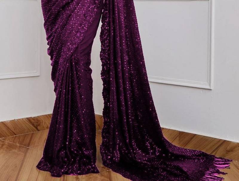 Wine color sequence embrodery work georgette saree