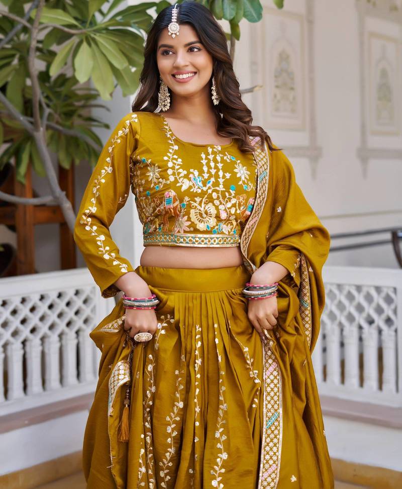 Yellow color embroidery sequence with thared work silk lahenga choli set