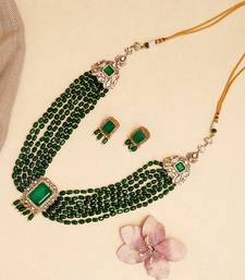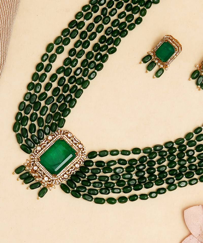 | Product Description | Make A Statement With This Long Necklace Set In Multi Lines Of Emeralds, Designed To Exude Royalty And Sophistication. Featuring Rows Of Finely Set Semi Precious Emerald Stones And An Elegant Pendant Studded With Matching Emeralds, This Designer Jewellery Piece Is Perfect For Brides, Festive Occasions, And Regal Celebrations.
