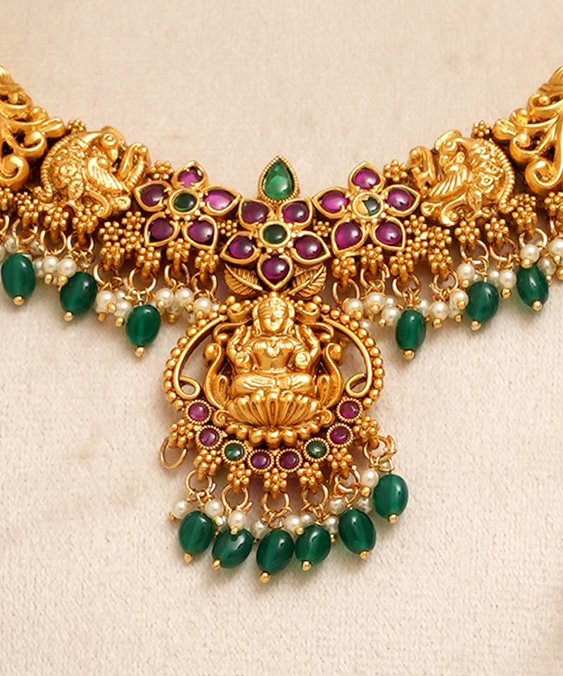 | Product Description | This Gold Plated Green Stones Temple Necklace Set Features Exquisite Temple Inspired Motifs Highlighted With Vibrant Green Stones And A Radiant Gold Finish. Designed To Complement Traditional Silk Sarees And Bridal Attire, It Is Perfect For Weddings, Poojas, And Festive Occasions, Adding Divine Charm And Regal Elegance To Your Look.