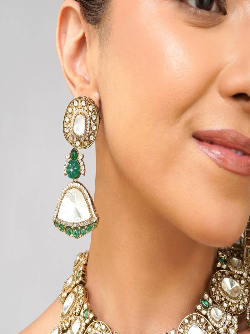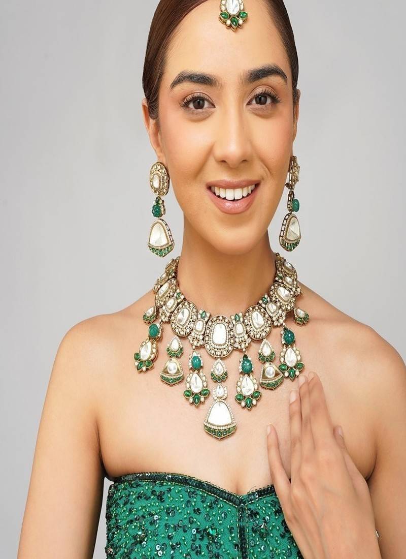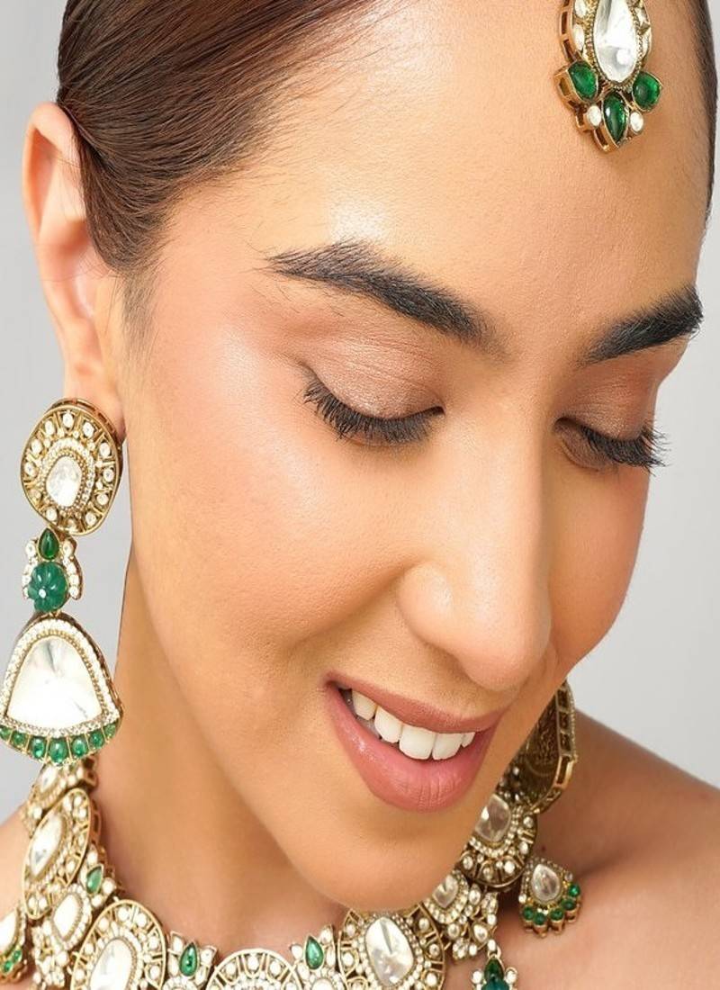 Product Description | Radiate Elegance With This Natural Color Kundan Necklace Set, Adorned With Rich Emerald Green Pearls And Intricately Handcrafted To Mimic Real Gold Jewelry. Inspired By Royal Indian Aesthetics, This Statement Set Features A Timeless Design Finished In High Quality 22 K Gold Plating, Perfect For Weddings, Festive Events, And Grand Celebrations.