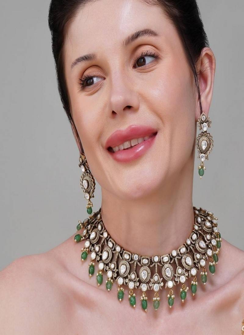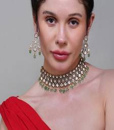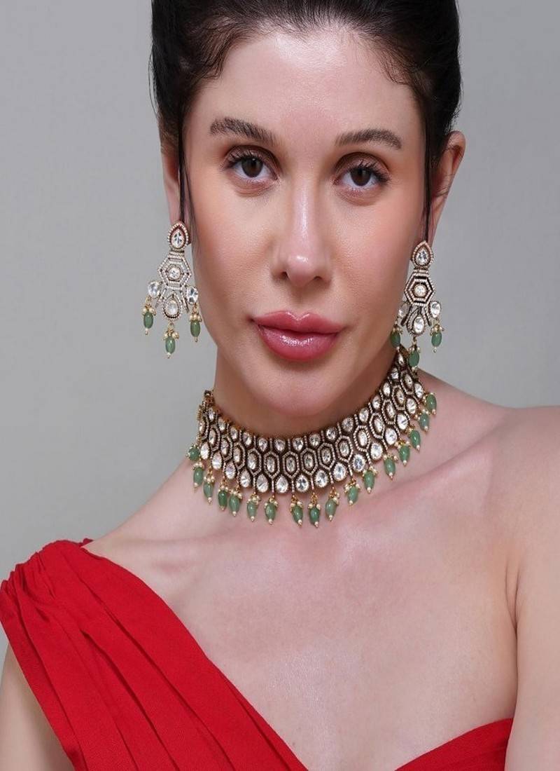 Product Description | Our Kundan Choker Set Adorned With Green Pearls, A Perfect Blend Of Traditional Charm And Refined Luxury. Handcrafted With Precision, The Choker Features Dazzling Kundan Stones Set In A Regal Design, Gracefully Finished With Cascading Green Pearl Droplets That Add A Touch Of Sophistication And Richness.