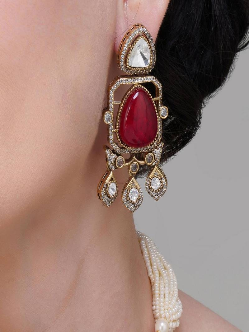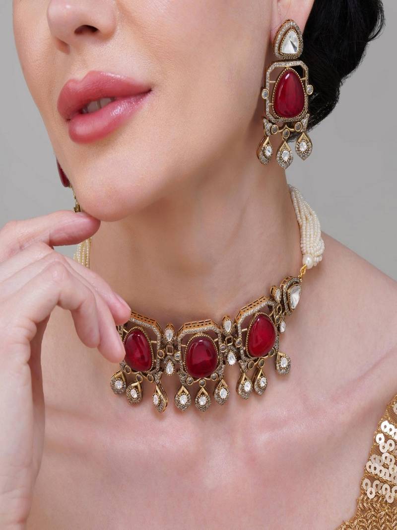 Product Description | Crafted Meticulously With Intricate Kundan Work, This Set Features A Bold Maroon Palette That Exudes Royal Charm. The Choker Is Adorned With Dazzling Uncut Stones Set In Antique Finish Gold Plating, Accentuated With Delicate Bead Droplets For A Touch Of Grace.Whether Paired With A Silk Saree Or A Richly Embroidered Lehenga, This Piece Is Sure To Turn Heads And Spark Compliments.
